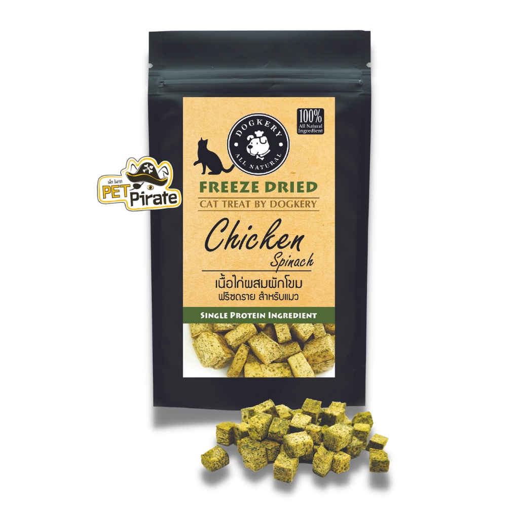 Dogkery ฟรีซดรายแมว #เนื้อไก่ผสมผักโขม Freeze Dried Chicken and Spinach (For Cat) หอม น่าทาน ไขมันต่ำ ไม่มีกลูเต็น บรรจุ 12 กรัม