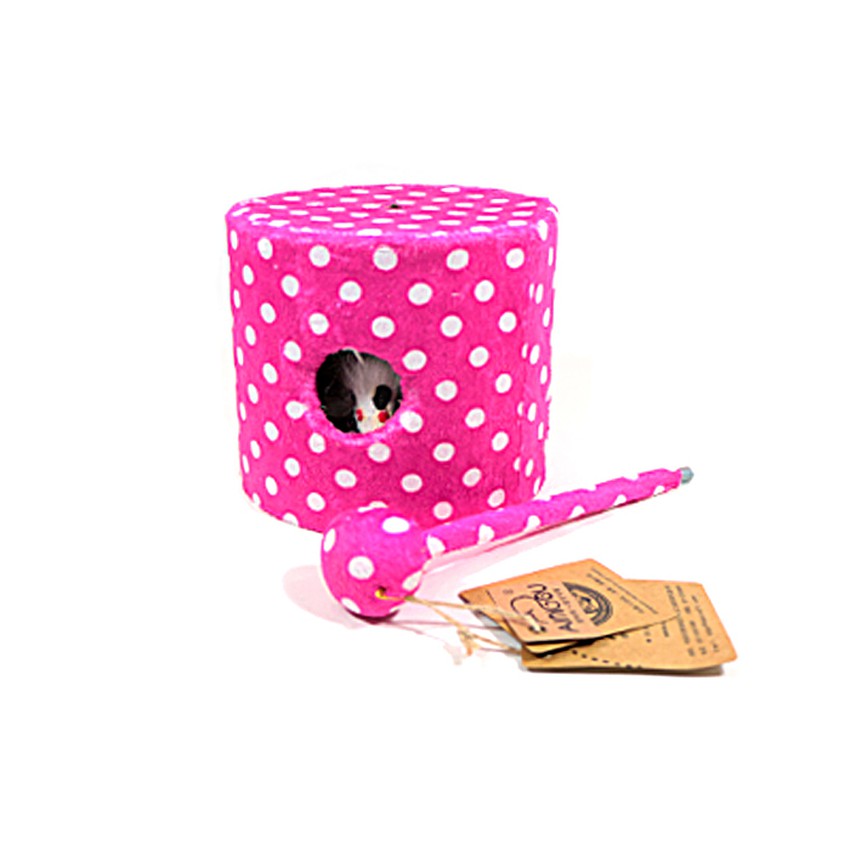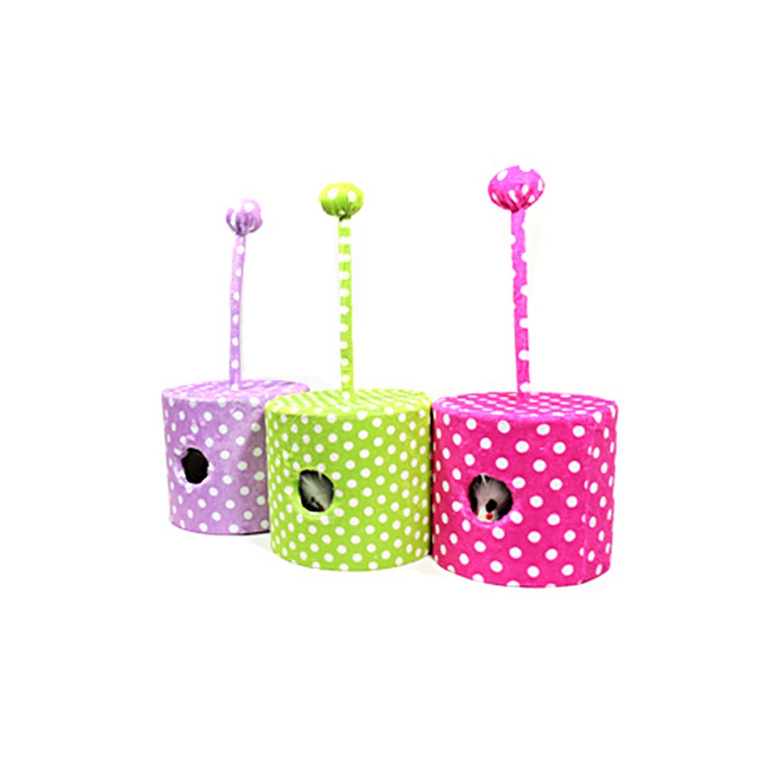 • กล่องไม้กลมห่อด้วยผ้านุ่มลายจุด มีรูให้น้องแมวล้วงเขี่ยของเล่นหนู