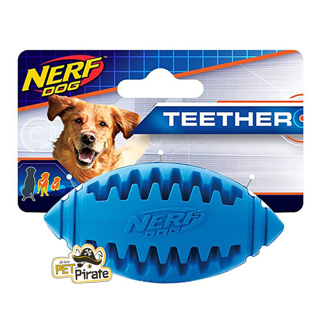 • Nerf Dog Teether Football ลูกอเมริกันฟุตบอล/รักบี้ยาง มีหยักรับฟันที่จะทำหน้าที่ขัดถูเอี๊ยดอ๊าดขณะที่เจ้าตัวแสบตั้งใจฟัดกัดแทะลูกฟุตบอลนี้อย่างเมามัน