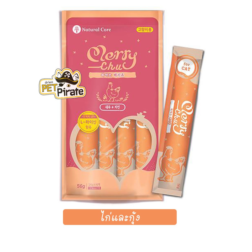 Natural Core Merry Chu ขนมแมวเลีย [ชุด 3 ห่อ] นำเข้าจากเกาหลี วัตถุดิบพรีเมี่ยม เกรดคนกิน วิตามินและแร่ธาตุครบ 56 g (Chicken+Shrimp)