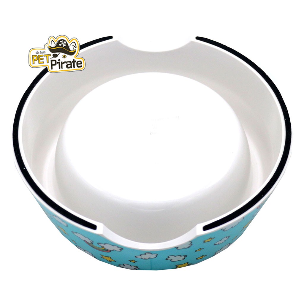 ชามหมาแมว ตัวชามเป็นสแตนเลสเนื้อดี ถอดล้างได้ วางบนฐานเมลามีนพิมพ์ลายสวยงาม (ลายแพนด้า สีฟ้า)