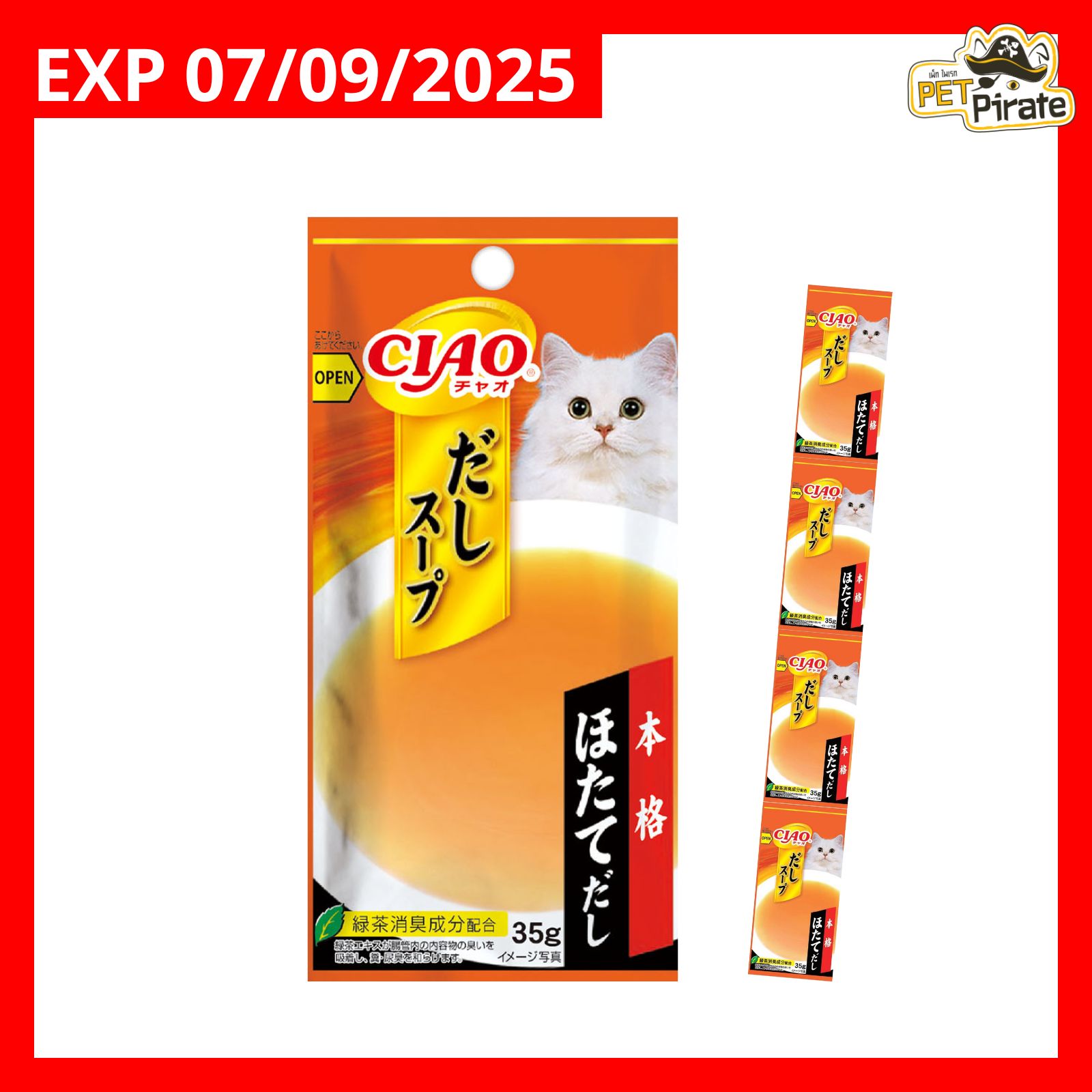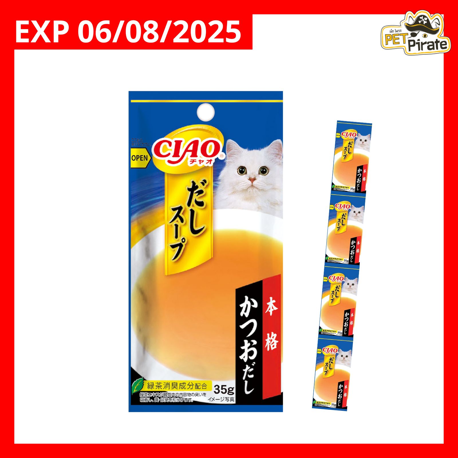 ซองสีแดง แอทลาส แคท ปลาทูน่าผสมปลารมควันในน้ำซุป น้ำซุปเข้มข้น ทำจากปลาทูน่าเนื้อเต็มคำ 100% โรยหน้าด้วยปลารมควันเพิ่มความหอม พร้อมเยลลี่เพิ่มความนุ่ม และวิตามิน E