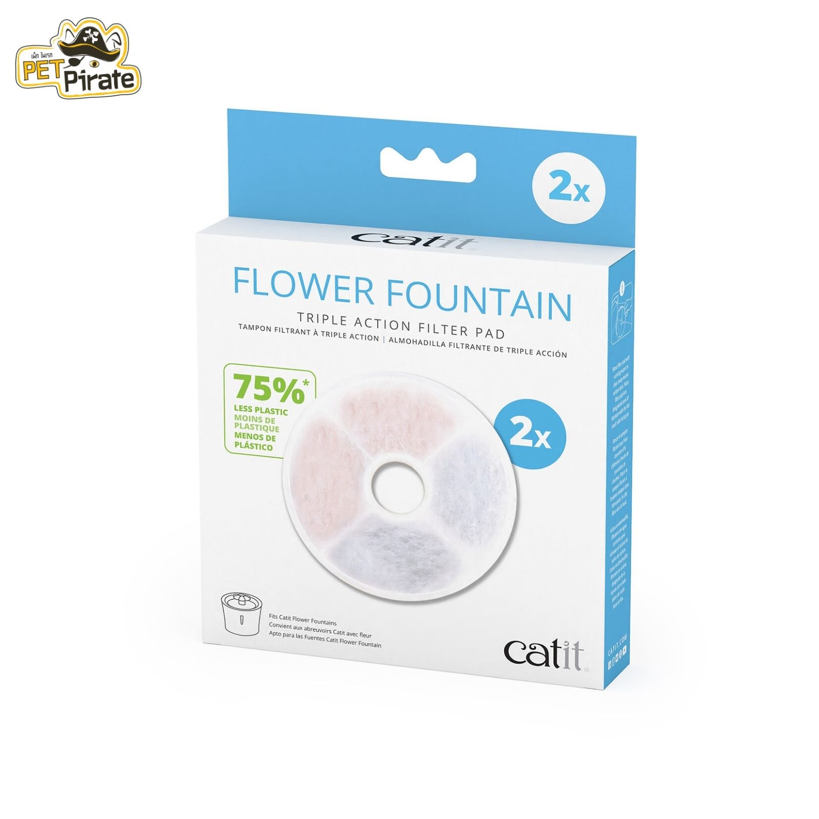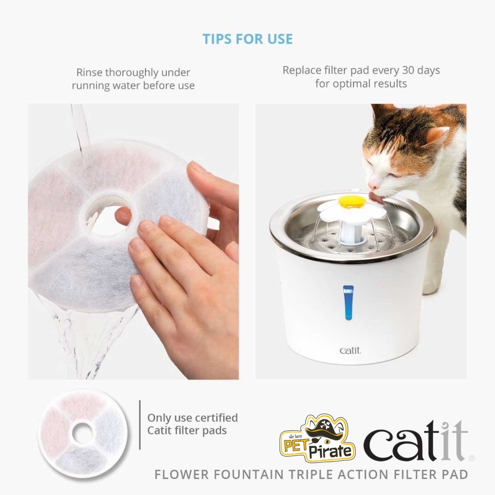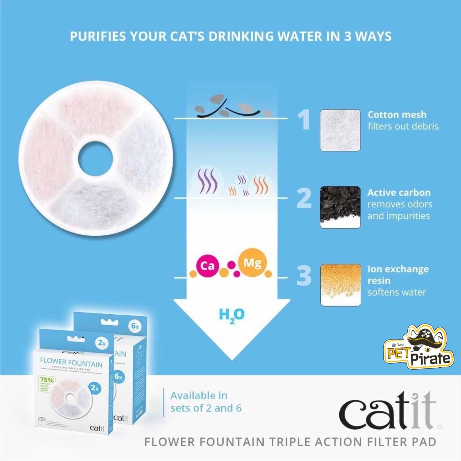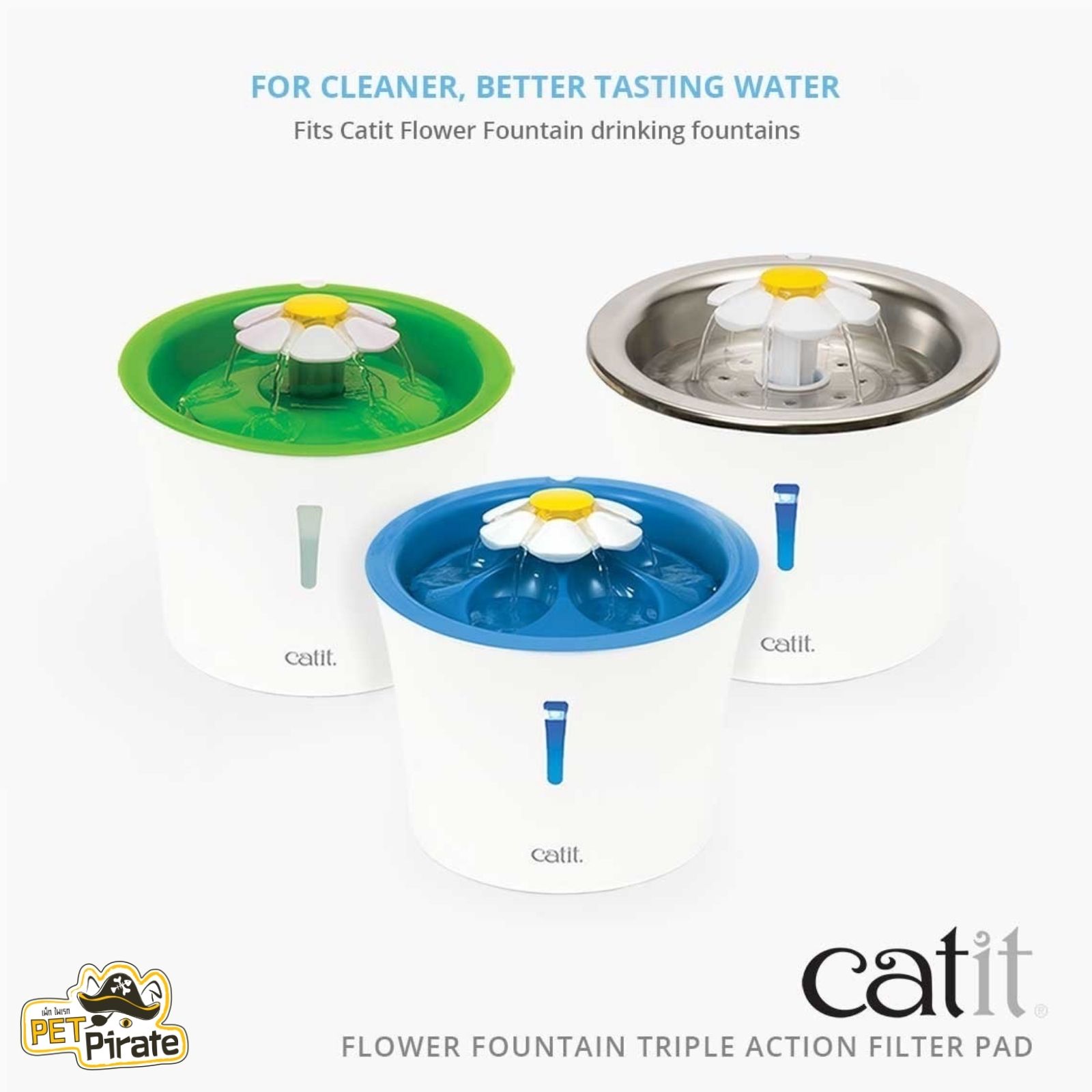 Catit Triple Action Flower Fountain Filter Pad ประกอบด้วยส่วนประกอบสามอย่างที่ดีเยี่ยมสําหรับการทําให้น้ําดื่มของแมวบริสุทธิ์